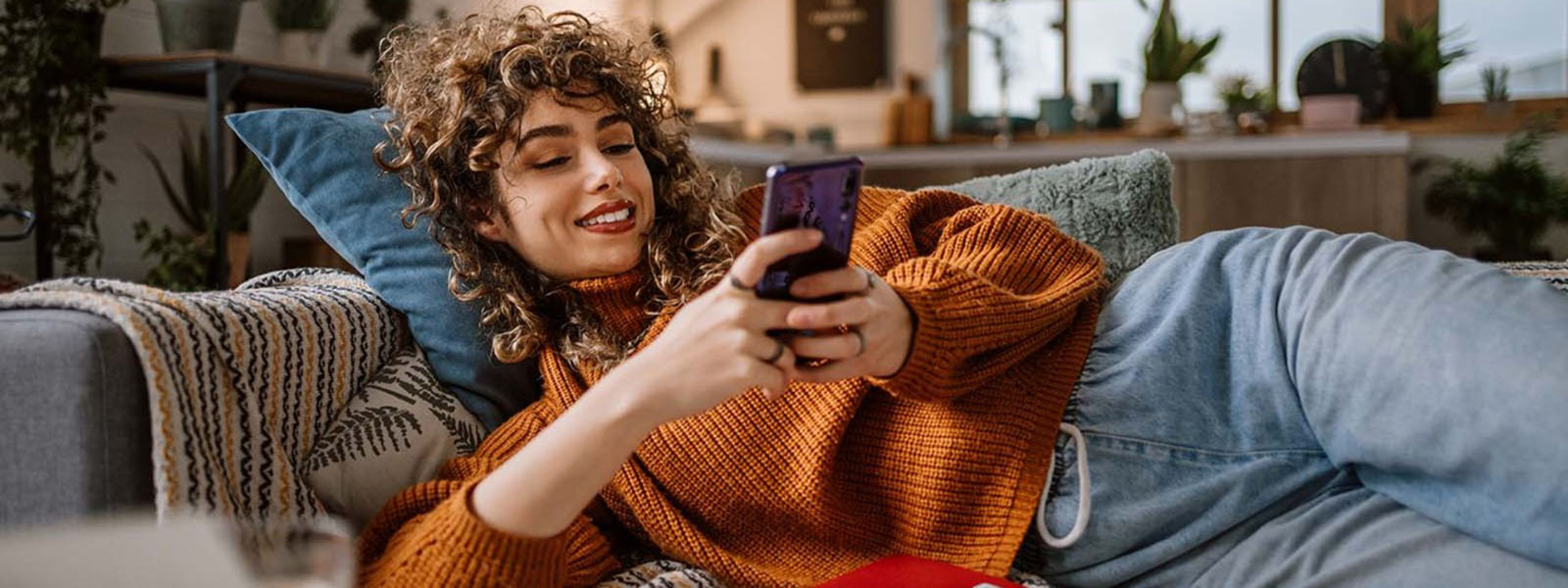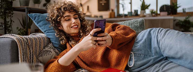 Mujer generación z utilizando su teléfono Mujer acostada en un sillón usando el celular