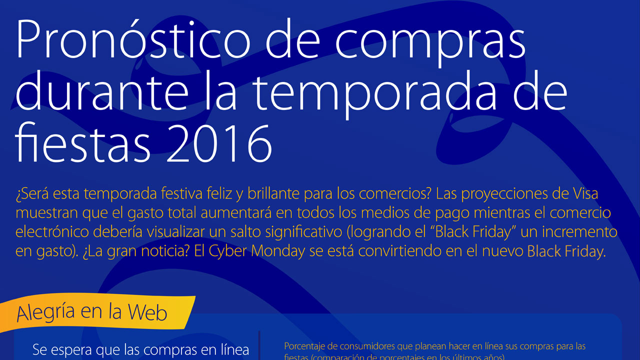 Visa, líder en los pagos digitales, predice que numerosos norteamericanos recurrirán a sus tabletas, teléfonos y computadores este año, convirtiendo la del 2016 en la temporada de compras en línea de Navidad y fin de año más activa que jamás se haya visto en Estados Unidos2. Según un estudio de consumidores realizado por Visa, en esta temporada de compras de Navidad y fin de año: